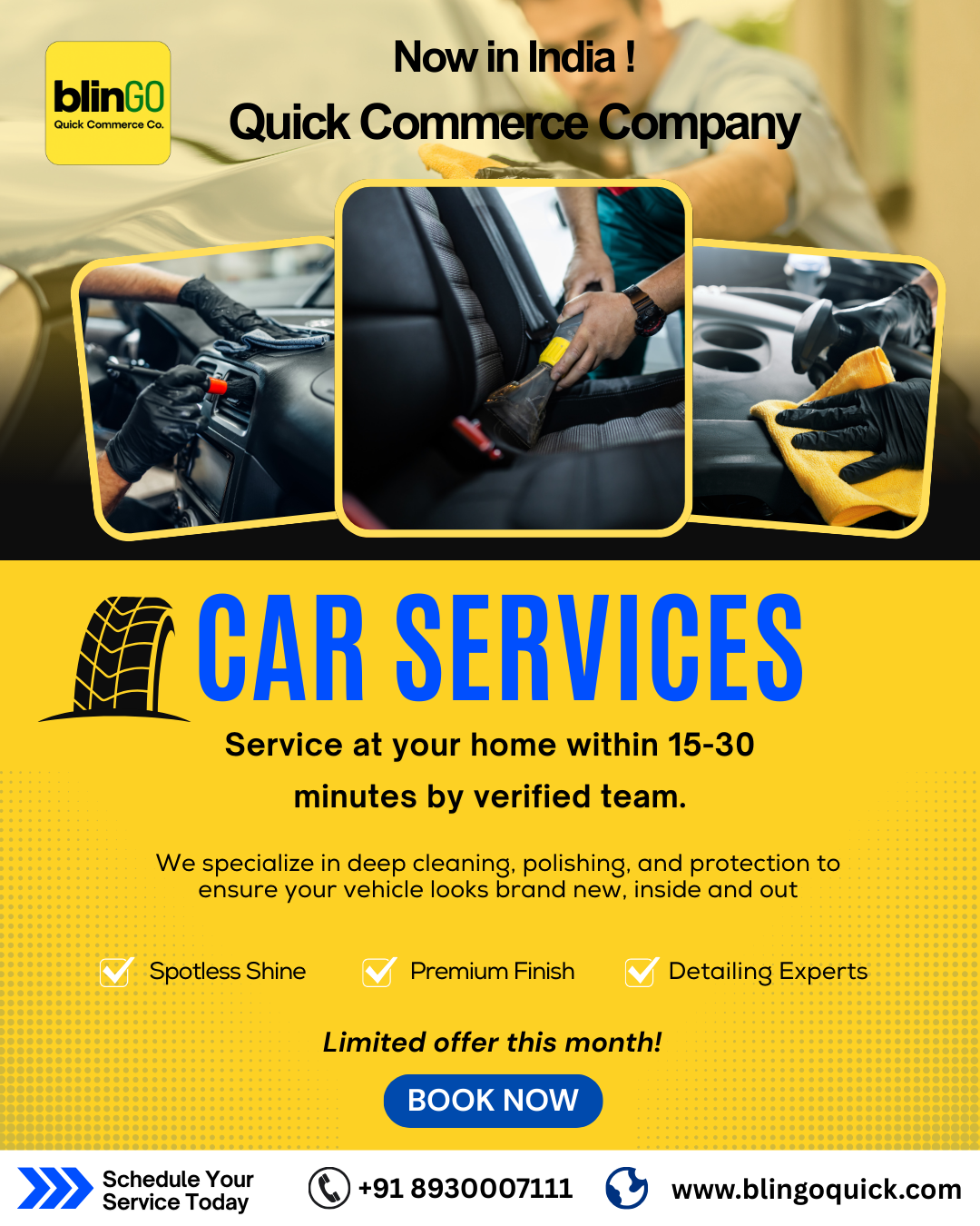 Whether it’s a dusty exterior, a stained interior, or a faded finish, BlingoQuick makes it effortless to bring back your vehicle’s premium feel. Our certified detailers deliver industrial-grade cleaning and protection right to your home or office—so you can skip the service center wait and get back to the drive.
